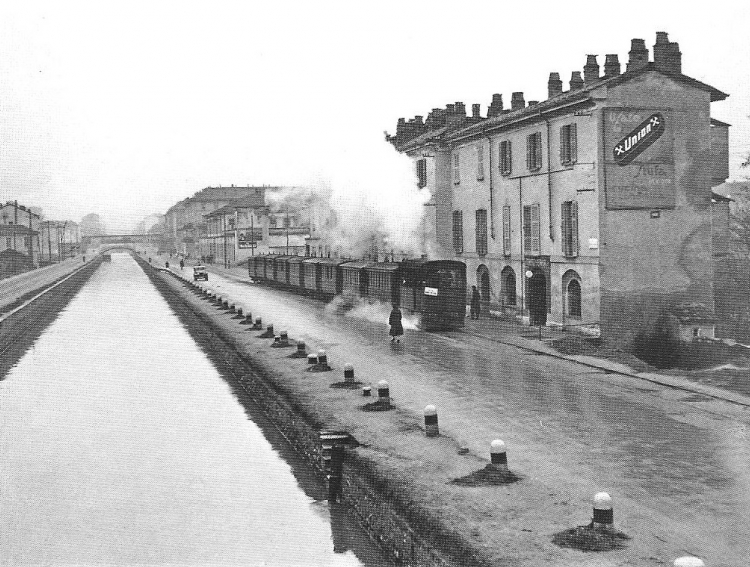 Il Naviglio Pavese lungo la via Ascanio Sforza con il vecchio trenino a vapore della linea di Milano - Pavia, 1935
